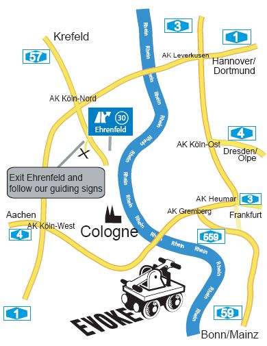 If you come from Bonn via the A59, change onto the A4 to "Aachen" at "Kreuz Köln-Süd" to go ahead to "Kreuz Köln-West" where you change to the A1 (direction "Dortmund"), then you reach "Kreuz Köln-Nord" where you switch motorways to the A57. Stay on this street until exit #30 (Köln Ehrenfeld) and follow our photo guide from there.