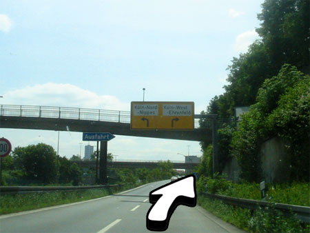 Coming from direction Aachen? Easy! Change onto the A1 (direction "Dortmund") and stay there until you reach "Kreuz Köln-Nord" where you switch over to A57 to "Zentrum". Stay on that motorway until exit #30 comes along, leave the A57 there and follow the photo guide then.