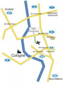 If you are on the A57, coming from direction Krefeld or Düsseldorf, get on the A1 at "Kreuz Köln-Nord" into direction Dortmund. At "Kreuz Leverkusen" change on A3, direction "Frankfurt/Köln". Then leave at "Kreuz Köln-Ost" on the B55a (Direction "Köln-Zentrum/Köln-Deutz"). From there on, follow the photo guide.